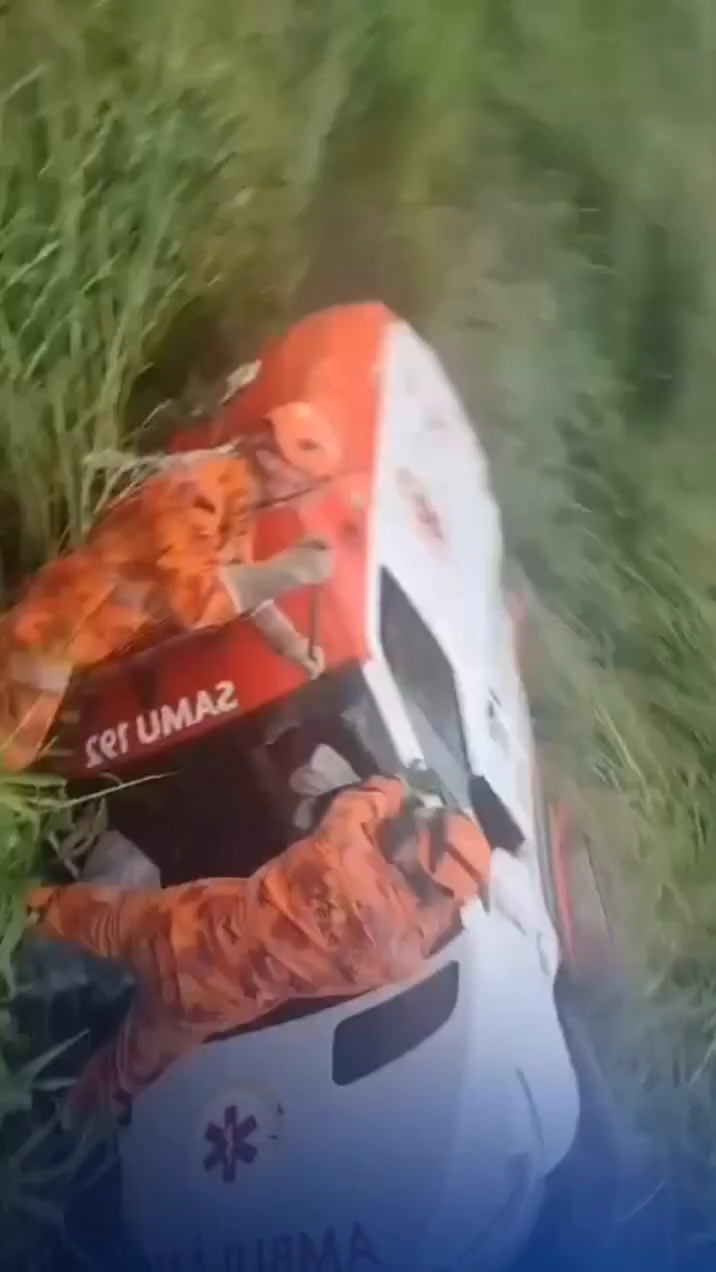 Imagens registradas por testemunhas mostram o veículo bastante danificado após sair da pista e cair em uma área de mata às margens da rodovia. O impacto deixou a parte frontal da ambulância parcialmente destruída.