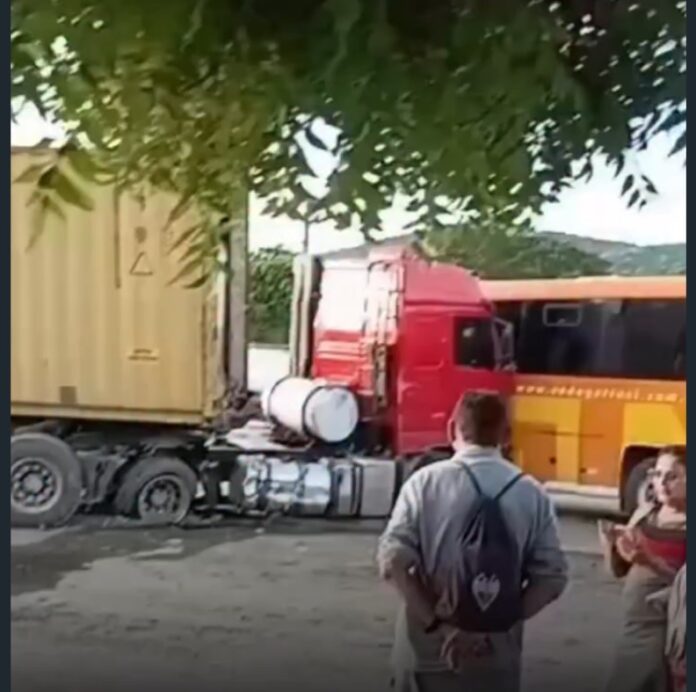 Sem conseguir manter a direção, o caminhão acabou atingindo dois ônibus que estavam parados em uma parada às margens da rodovia. Com a força da colisão, três pneus da carreta estouraram e o tanque de combustível do veículo ficou danificado.