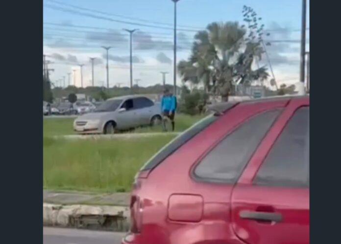 Um carro acabou subindo a rotatória e ficou parado sobre a área destinada à circulação de pedestres e ciclistas. A situação surpreendeu motoristas e pedestres que transitavam pelo local, conhecido pelo grande fluxo de veículos ao longo do dia.