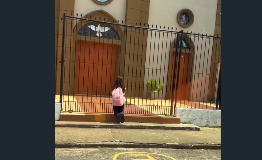 Nas imagens, a jovem aparece vestindo o uniforme escolar e com a mochila nas costas, em um momento de oração antes de seguir para a escola. O gesto espontâneo chamou atenção nas redes sociais, gerando comentários sobre a fé e a devoção de crianças e adolescentes em meio à rotina escolar.