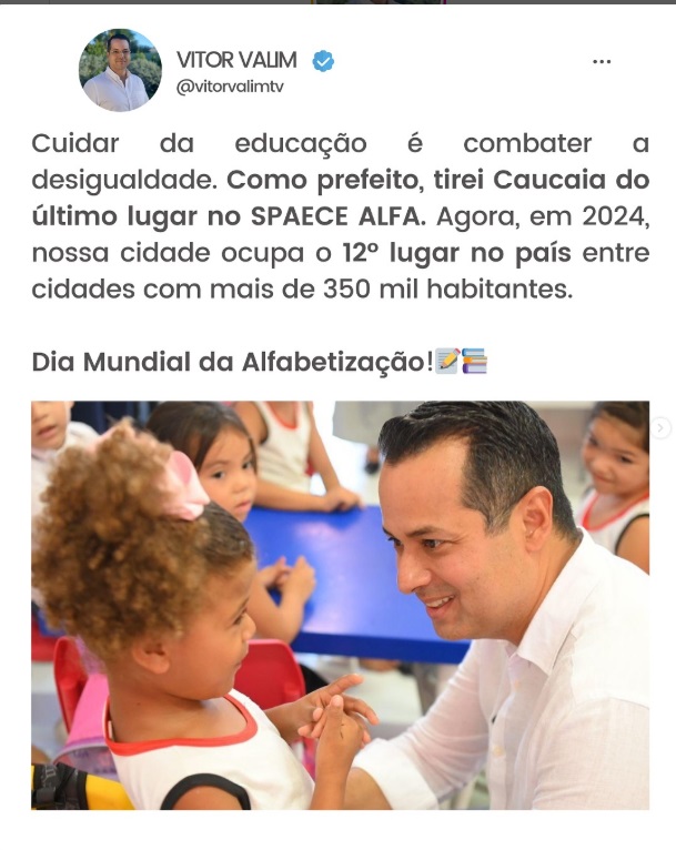 O ex-prefeito de Caucaia, Vitor Valim (PSB), utilizou as redes sociais para relembrar e comemorar os avanços alcançados na área da educação durante o período em que esteve à frente do município, entre 2021 e 2024.