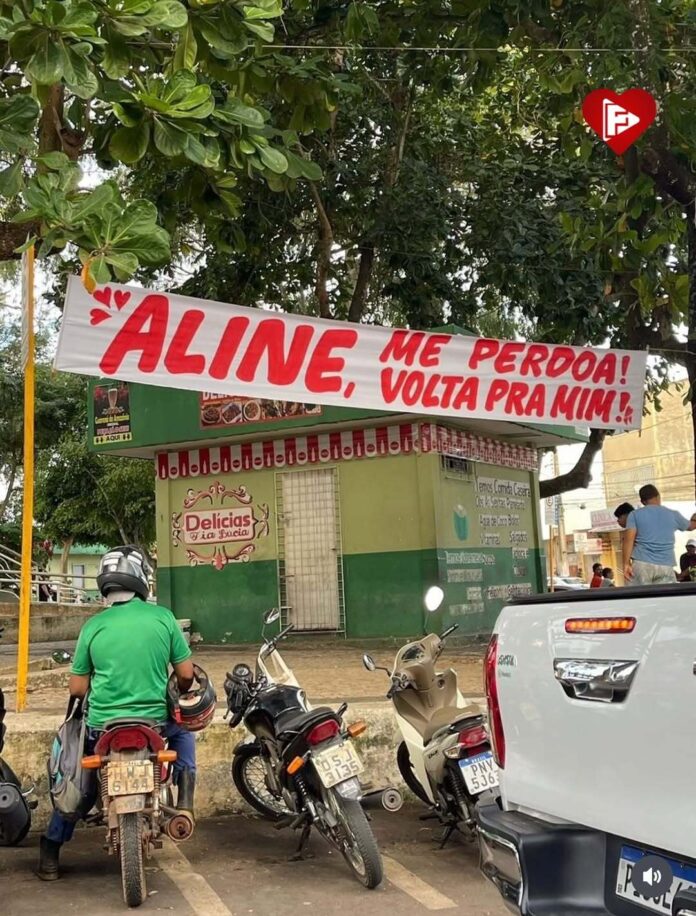 “Aline, me perdoa! Aline, volta pra mim!” — dizia a mensagem, escrita em letras garrafais e posicionada estrategicamente em uma área de grande circulação. A declaração pública, ainda envolta em mistério, dividiu opiniões: seria um verdadeiro pedido de reconciliação amorosa ou uma ação publicitária pensada para causar impacto na data romântica?